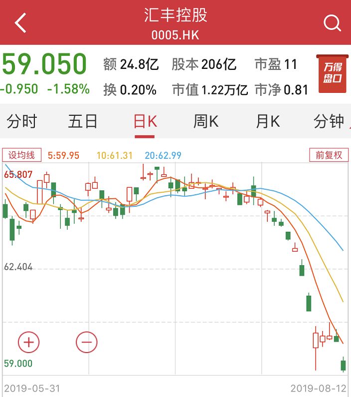 在汇丰裁员和离职消息爆出后,汇丰控股股价一路下行。8月12日汇丰控股再度下跌1.58%,报59.05港元,总市值12168亿港元。半个月时间,总市值蒸发达1174亿港元,约合近1056亿人民币。