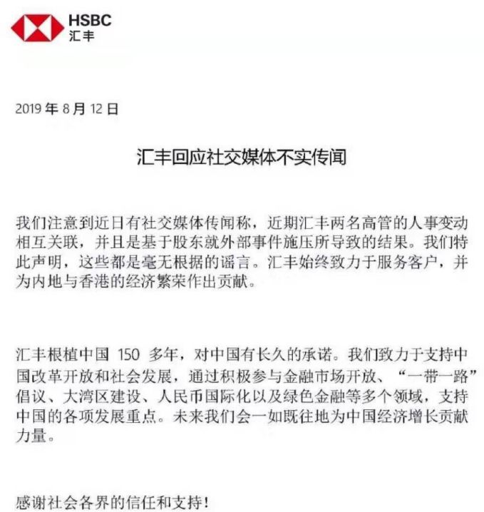 汇丰控股12日公开回应称:我们注意到近日有社交媒体传闻称,近期汇丰两名高管的人事变动相互关联,并且是基于股东就外部事件施压所导致的结果。我们特此声明,这些都是毫无根据的谣言。汇丰始终致力于服务客户,并为内地与香港的经济繁荣作出贡献。