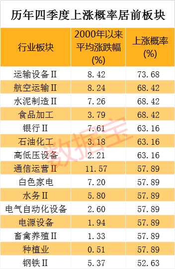 从2000年以来的历史表现发现,四季度上涨概率最高的是运输设备板块,近十九年来该板块上涨概率达到73.68%。