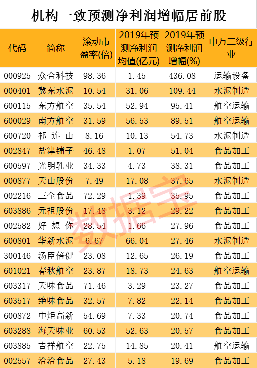数据宝在上述运输设备、航空运输、水泥制造、食品加工四大板块中,筛选出机构一致看好的上市公司。数据显示,获5家以上机构一致预测2019年度净利润增幅超过10%的个股,共计30只。从净利润预测增幅来看,众合科技、冀东水泥、东方航空、南方航空、祁连山、盐津铺子等获机构一致预测净利润增幅超过50%。