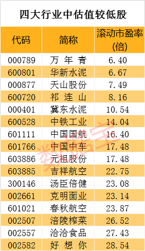 从最新估值水平来看,4股滚动市盈率尚不足10倍,分别是万年青、华新水泥、天山股份、祁连山,这4股均为水泥制造公司,万年青滚动市盈率最低,仅6.4倍。另外,水泥股冀东水泥滚动市盈率10.54倍,中铁工业滚动市盈率14.04倍,滚动市盈率较低的还有中国国航、中国中车、元祖股份、吉祥航空、汤臣倍健等。