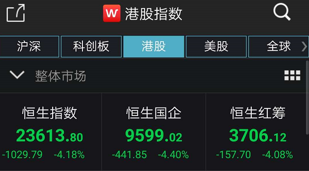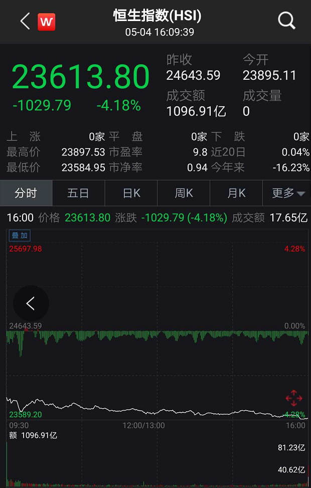 5月4日,港股遭遇重挫。香港恒生指数大幅低开逾3%,后扩大跌幅。截至当日收盘,下跌1029.79或4.18%,报23613.80点。恒生中国企业指数报收9599.02点或4.40%.