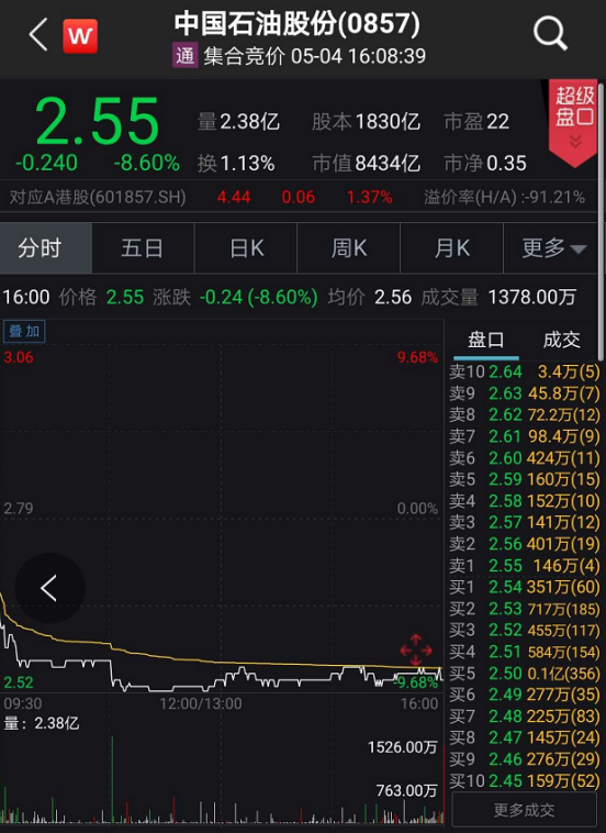 与此同时,受国际油价持续巨震影响,港股石油板块也遭遇了集体下跌,其中“三桶油”领跌。5月4日当天,中国石油股份跌近9%,中国海洋石油跌幅跌超7%,中国石油化工股份跌近9%。