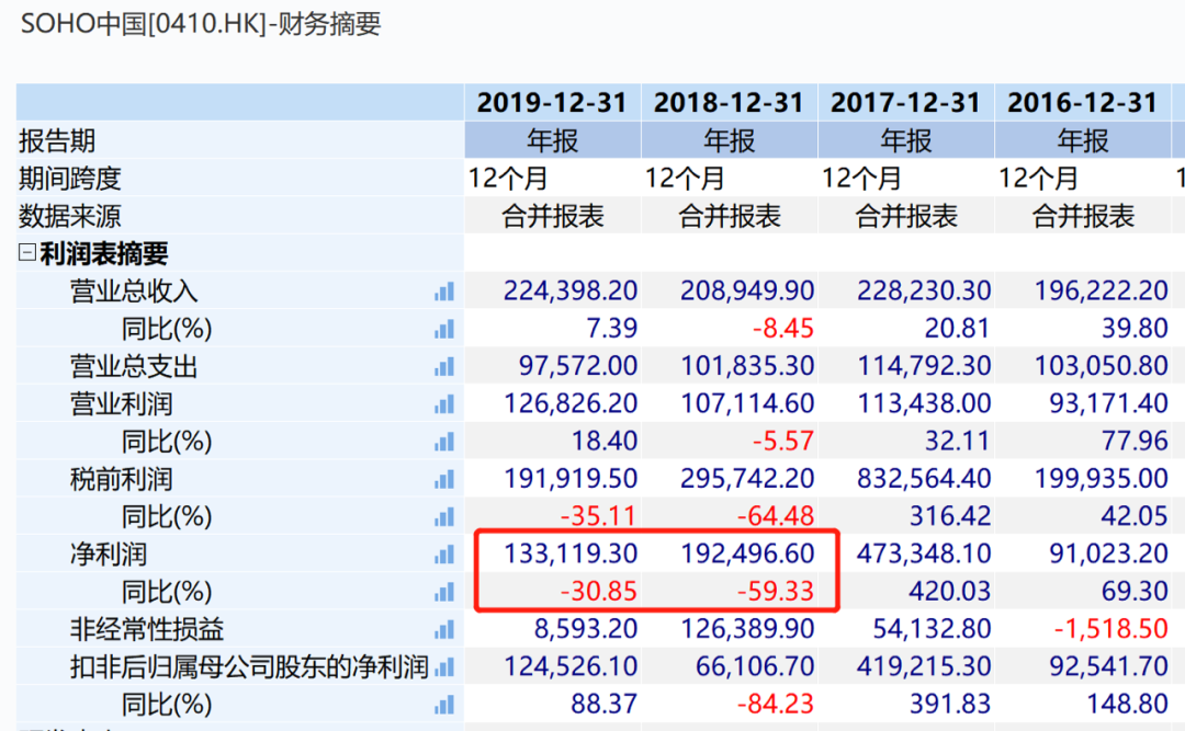 财报显示,2019年SOHO中国实现营业额约人民币18.47亿元(单位下同),同比增长约11%。本年度实现公司权益股东应占净利润约人民币13.31亿元,同比减少30.85%。其中,每股基本盈利0.26元,不派息,这也是SOHO中国上市以来首次不派发股息。