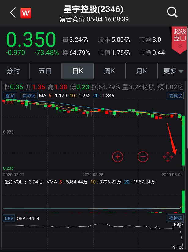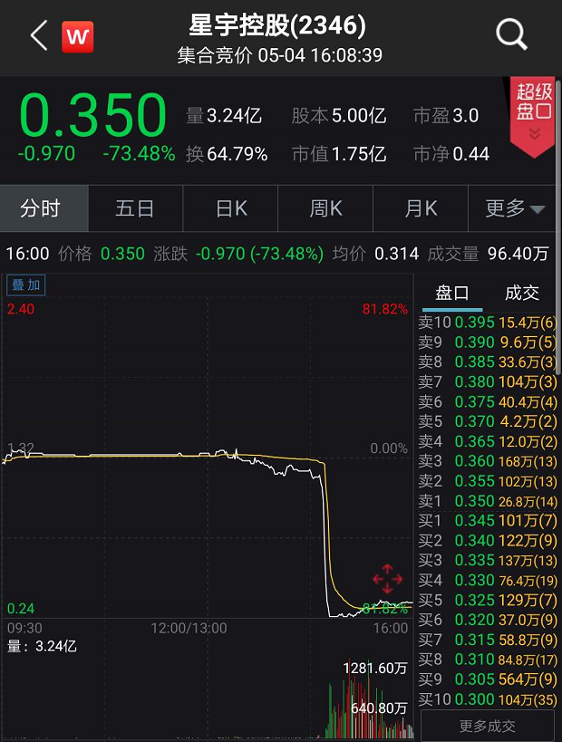 5月4日,港股上市公司星宇控股午后突然遭遇洗仓,股价出现了“断崖式”下跌,仅仅10分钟跌幅就超80%,股价创下历史新低位置。截至当天收盘,股价仍然跌超73%以上。
