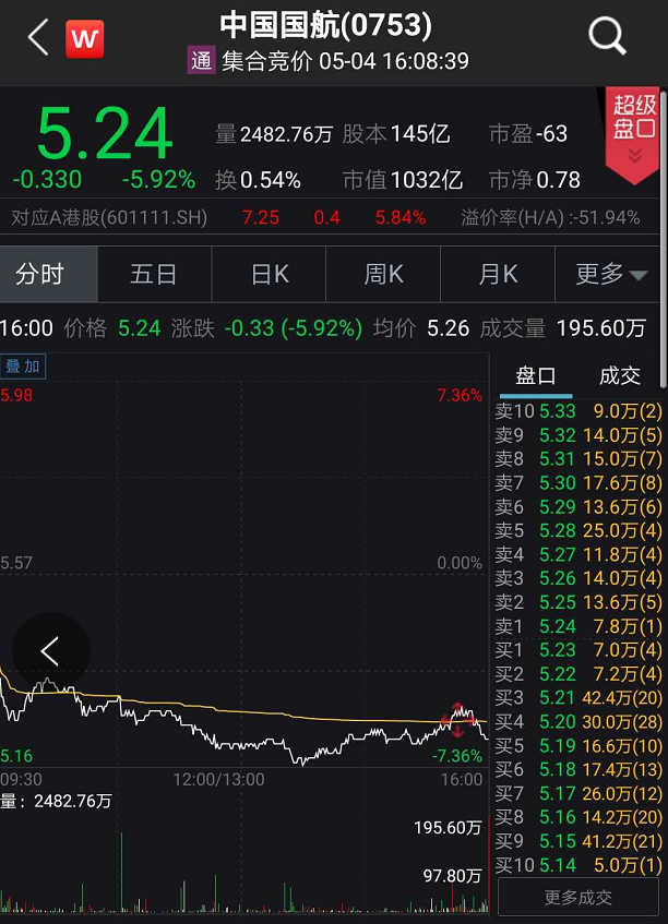 港股航空股集体大跌,中国国航股价跌5.92%,中国南方航空股份跌超6%,中国东方航空股份跌超4%。