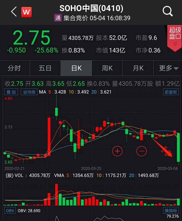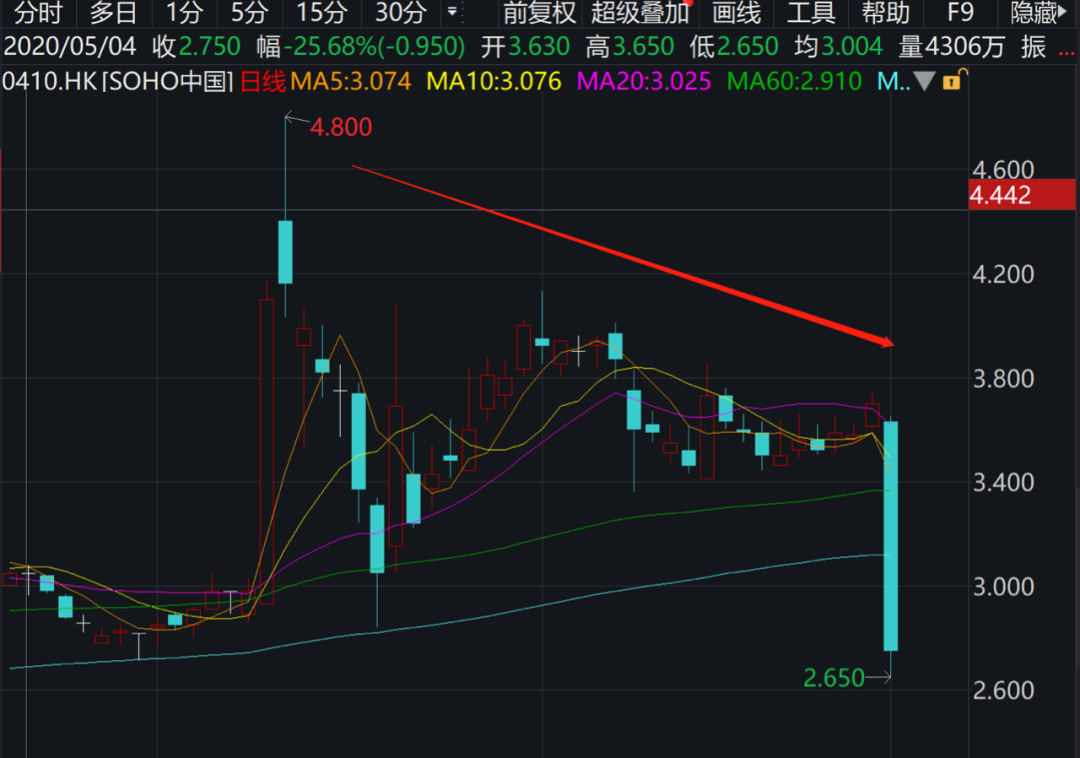 5月4日下午,港股上市公司SOHO中国尾盘也出现了快速跳水的行情,短短几分钟时间,股价跌幅就超过25%以上。