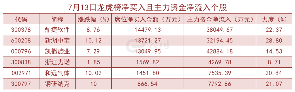 7月13日龙虎榜中机构及营业部席位资金净卖出16.83亿元,其中净买入的个股有14只;净卖出的个股有33只。净买入金额居前的个股分别是鼎捷软件、新湖中宝、凯撒旅业等,净买入金额占当日成交额比例达8.51%、12.28%、4.42%。