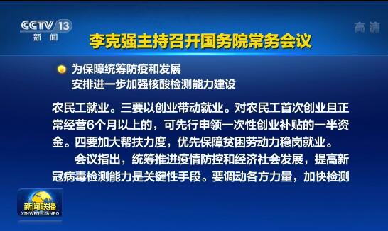 e公司讯,新闻联播7月29日报道,李克强主持召开国务院常务会议,为保障统筹防疫和发展,安排进一步加强核酸检测能力建设。