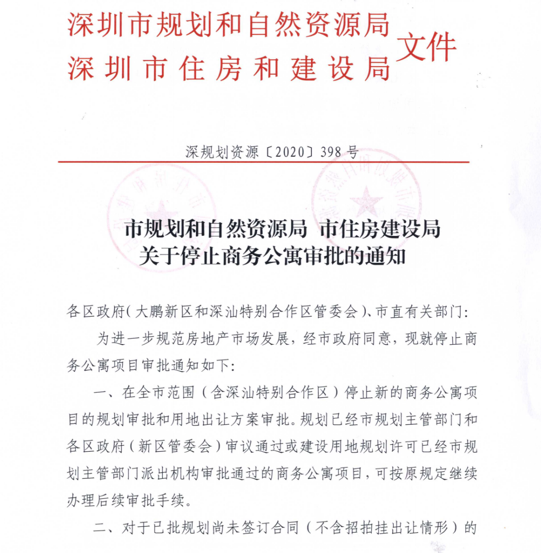 刚刚,深圳规土委和住建局联合发布《市规划和自然资源局市住房建设局关于停止商务公寓审批的通知》。