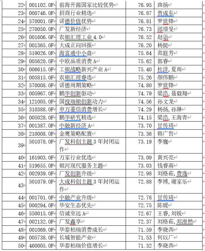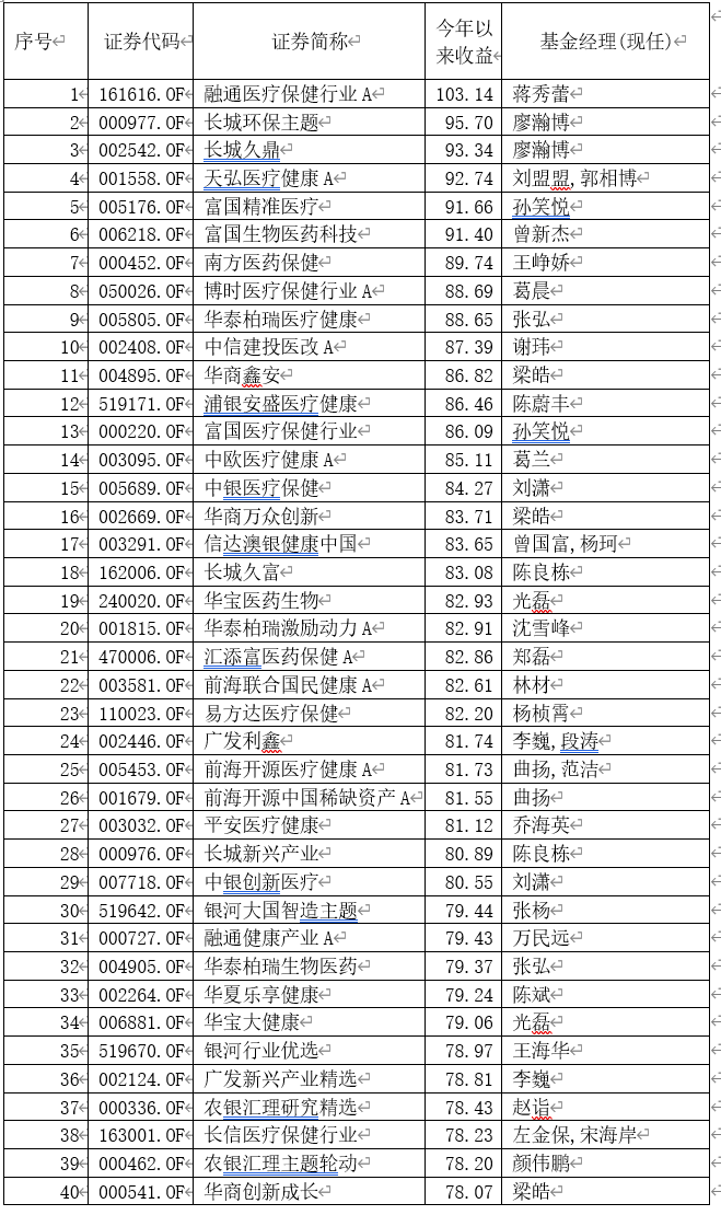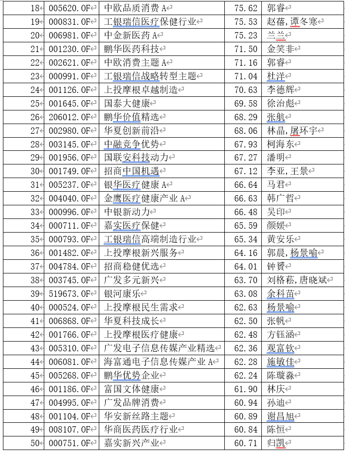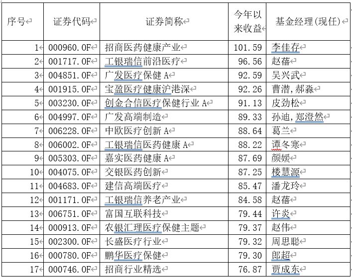 基金君剔除“医药”、“医疗”、“健康”、“养老”、“生物”等出现在基金名称中的品种,也有一些非医药类收益率在70%之上。廖瀚博管理的长城环保主题、长城久鼎,广发高端制造、长城久富、华泰柏瑞激励动力、广发利鑫等表现较好。