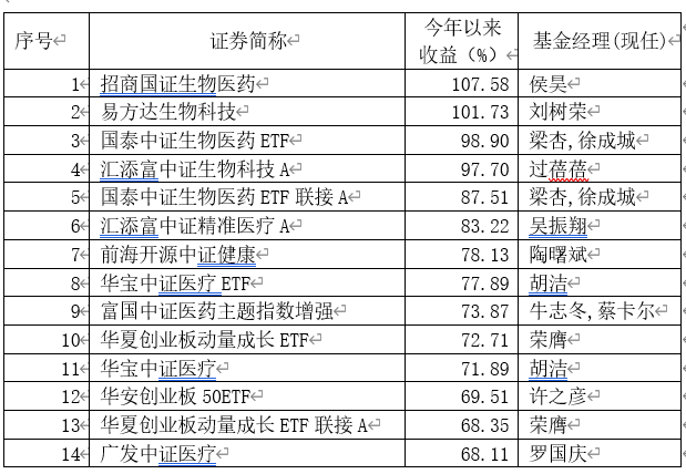 具体来看,今年业绩领先的是医药基金,表现较好的是招商国证生物医药、易方达生物科技,收益率均超过100%,达到107.58%、101.73%。此外,国泰中证生物医药ETF、汇添富中证生物科技、国泰中证生物医药ETF联接、汇添富中证精准医疗等表现也不错。