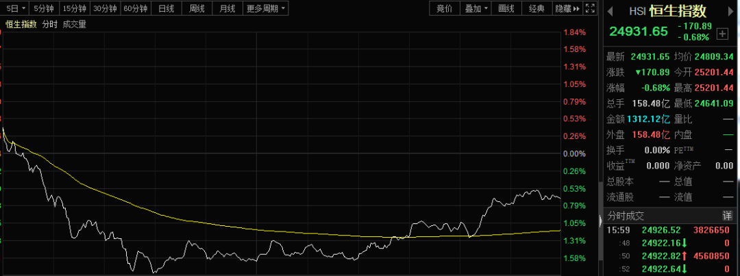 与此同时,在隔夜外围市场表现稳定的背景之下,一向紧跟外围市场的香港股市也出现调整,恒生指数一度大幅杀跌超1.8%,收盘则以下跌近0.7%。