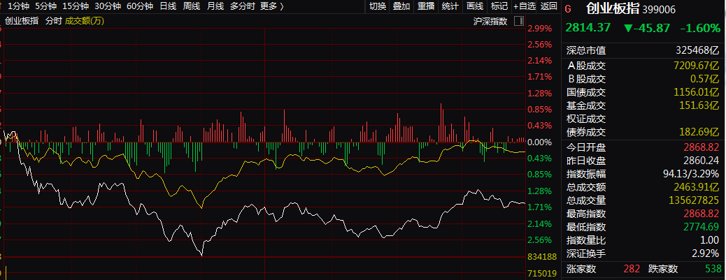 此前一直高喊三千点的创业板指跌1.6%,报2814.37点,但盘中跌近3%,再度成为市场拖累。