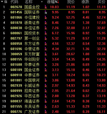 尾盘15分钟内,浙商证券、第一创业、中银证券、中信建投、中信证券、财通证券等券商股拉涨逾3%。国盛金控、国联证券强势涨停,中信建投、浙商证券、中信证券盘中也一度触及涨停板。