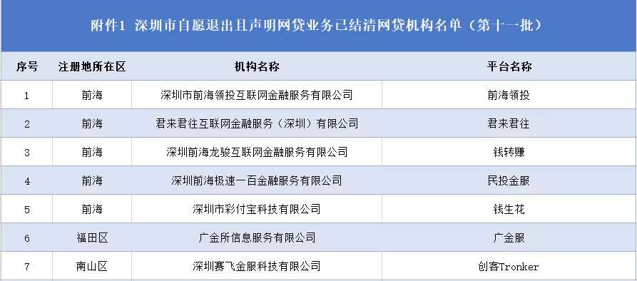 e公司讯,8月6日,深圳市互联网金融风险专项整治工作领导小组办公室公布第十一批7家自愿退出且声明网贷业务已结清的网络借贷信息中介机构名单。涉及的存量债权未结清的出借人可在通知发布之日起15日内向网贷机构所在区金融工作部门申报存量网贷债权。