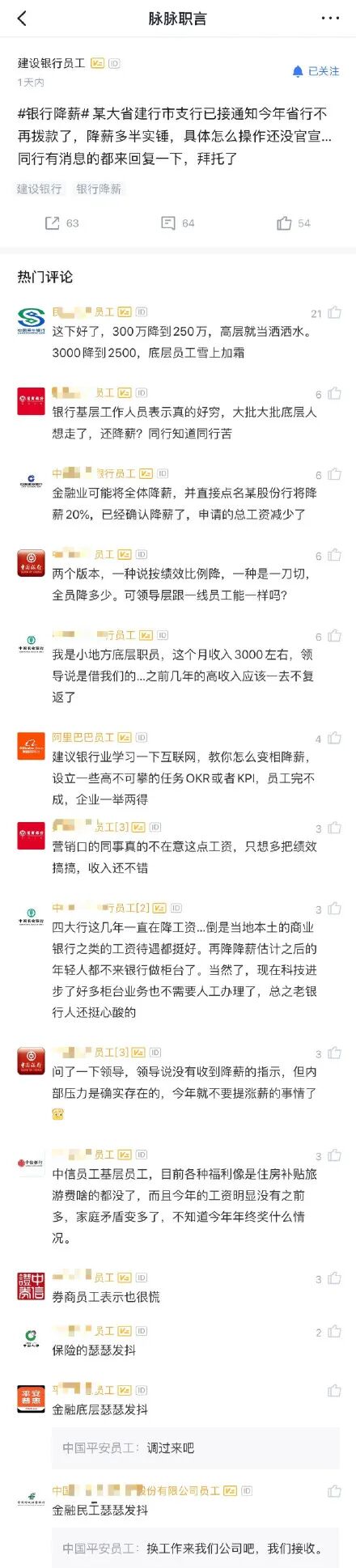 这两天,金融圈银行降薪的消息传得沸沸扬扬,更有点名中信银行将降薪20%,建行30%!