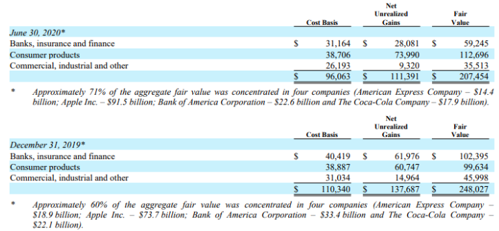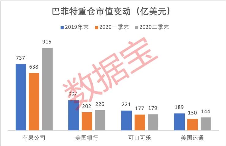 巴菲特前四大重仓股合计贡献了其二季末约71%的股票持仓市值,除苹果外,另外三只重仓股美国银行、可口可乐和美国运通的二季末持仓市值均未超过上年末水平。