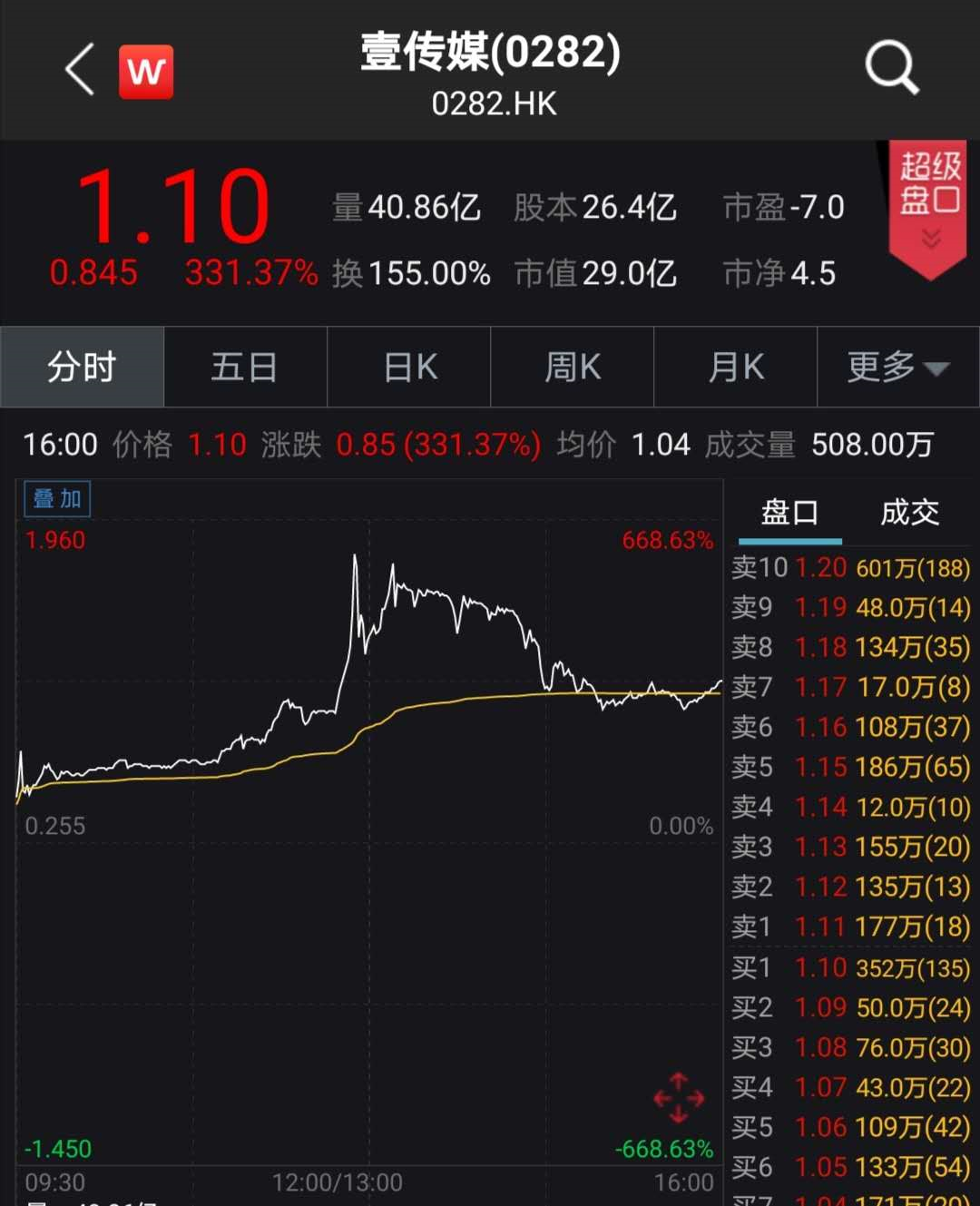 11日,港股壹传媒延续昨日的涨幅,盘中一度涨超600%,市值近40亿港元。两日内该股涨幅一度超1200%。