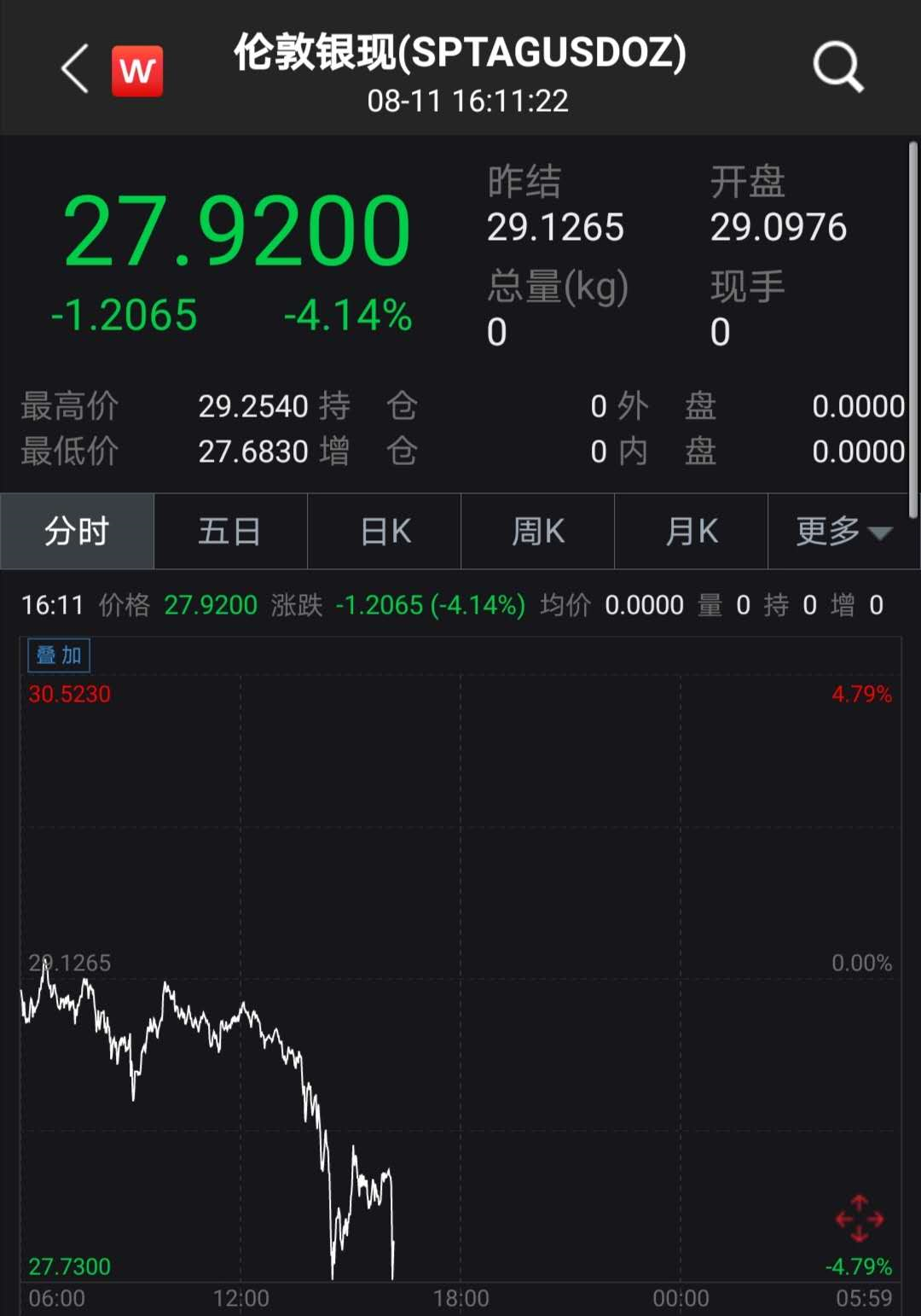 截至发稿,伦敦银现跟随伦敦金现的走势,再度跌破28美元。