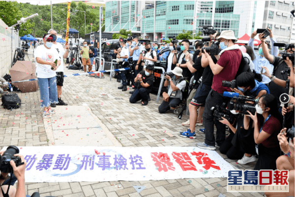 当天,香港将军澳“壹传媒”大楼外,有市民到场开香槟庆祝。