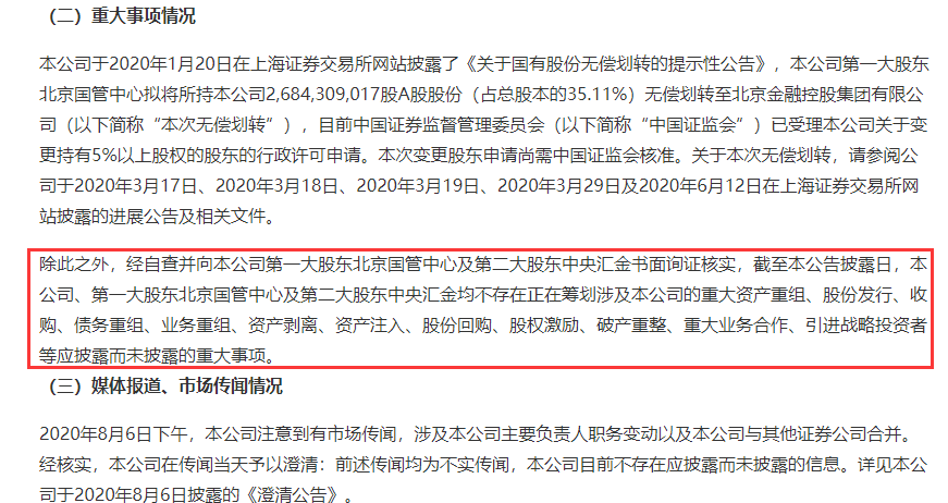 中信建投证券称,经公司自查并书面询证公司第一大股东北京国管中心及第二大股东中央汇金,截至本公告披露日,本公司、北京国管中心及中央汇金均不存在正在筹划涉及本公司的重大资产重组、股份发行、收购、债务重组、业务重组、资产剥离、资产注入、股份回购、股权激励、破产重整、重大业务合作、引进战略投资者等应披露而未披露的重大事项。