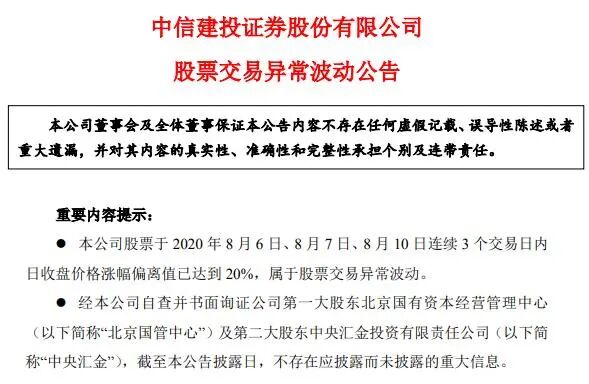 上周四,即8月6日下午,市场上关于中信建投与中信证券合并的传言再起,当天,中信建投A股股价收涨9.24%。当晚,中信建投证券就发布了澄清公告。