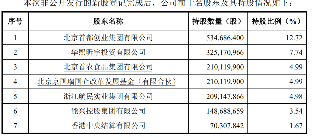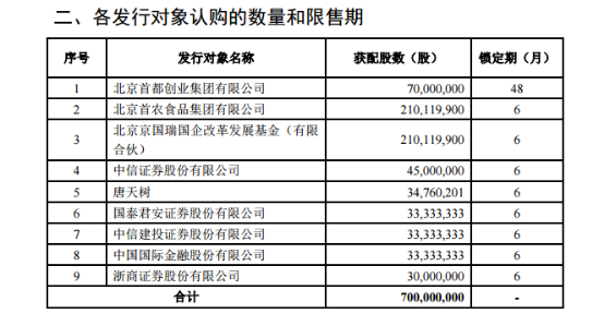 发行对象共有9名,分别为北京首都创业集团有限公司(下称“首创集团”)、首农集团、北京京国瑞国企改革发展基金(有限合伙)、中信证券、唐天树、国泰君安、中信建投、中国国际金融股份有限公司、浙商证券股份有限公司。