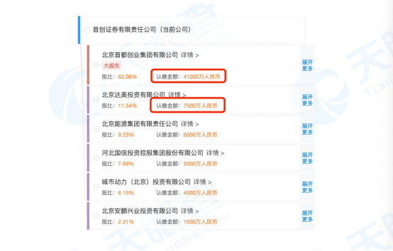 据天眼查信息,截至目前,首创证券的控股股东是北京首都创业集团有限公司(下称“首创集团”),认缴金额4.1亿元,持股比例为63.08%;其次是北京达美投资有限公司,认缴金额7500万元,持股比例为11.54%。