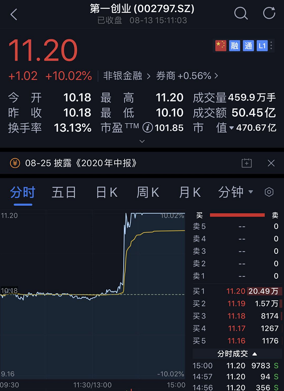 受此消息影响,第一创业股价瞬间涨停。