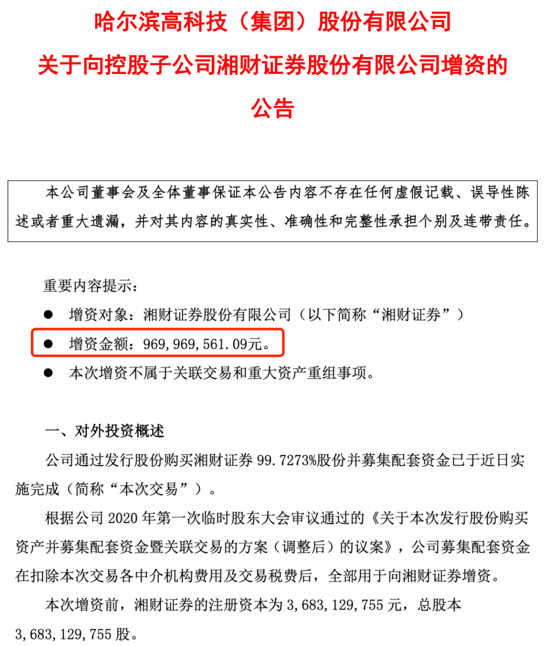 日前,哈高科通过发行股份购买湘财证券 99.7273%股份并募集配套资金已实施完成。根据事先约定,募集配套资金净额9.7亿元,将全部用于向湘财证券增资,增资价格为2.888元每股。