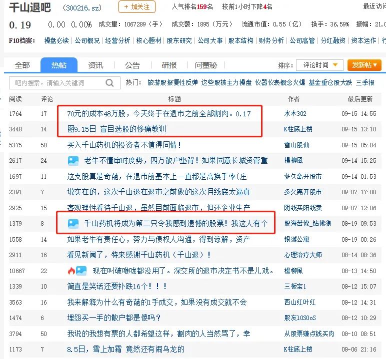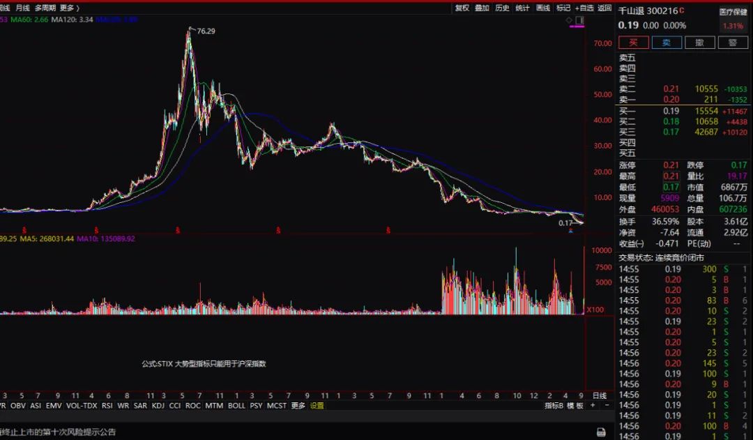 千山退以高位下来,到今日最低点跌幅为99.78%,到今日收盘跌幅为99.75%,均创造A股跌幅历史纪录。