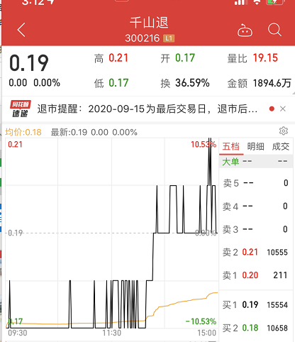 今日,千山退在A股的告别演出。29个一字跌停之后,股价在尾盘上演“地天板”绝地反击、资金火中取栗,给最后一天来了惊心动魄一幕,最终收平,不涨不跌以0.19元收官,总市值仅剩下6867万元,历史罕见。