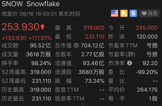 当地时间9月16日,硅谷的云计算服务公司Snowflake在美国纽交所上市,发行价为120美元,首日开盘翻倍,开盘报245美元。Snowflake的股票涨势凌厉,开盘仅两分钟便触发熔断,涨幅达130%。截至收盘,该股报253.93美元,涨111.6%。