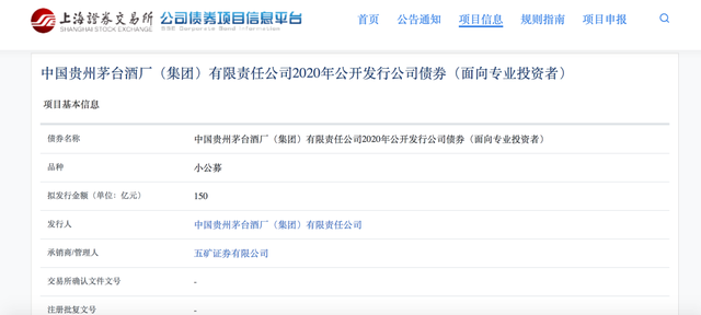 9月16日,上交所公司债券项目信息平台显示,贵州茅台的母公司——中国贵州茅台酒厂(集团)有限责任公司正在申请在上海交易所发行不超过150亿元人民币面向合格投资者的公开发行债券(即“小公募”),目前项目已获得上交所受理。