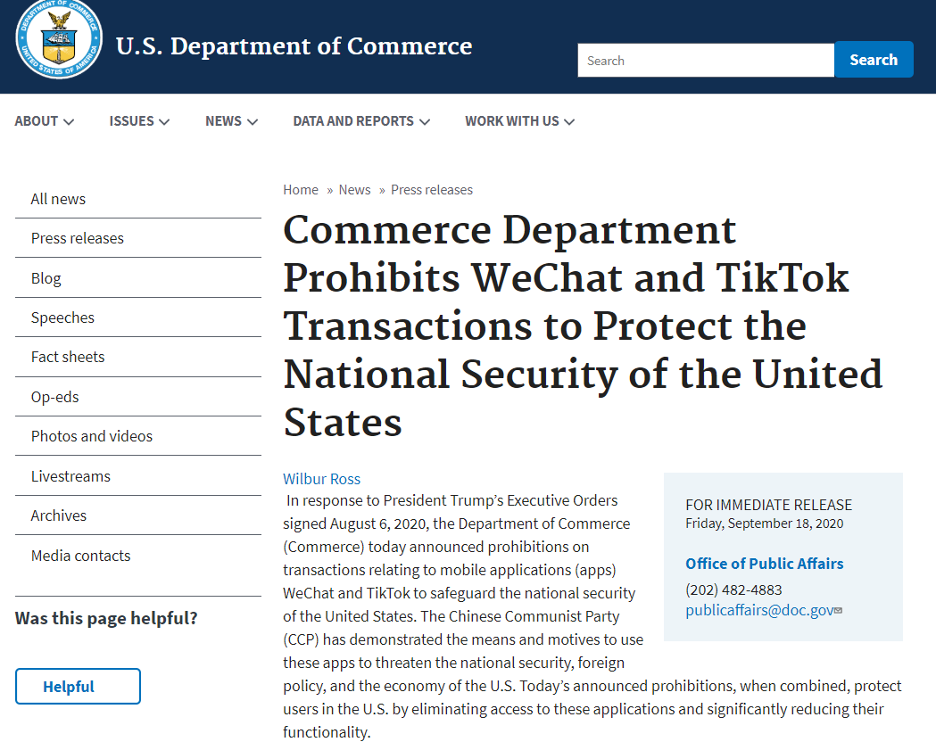 北京时间9月18日晚间,美国商务部在其官网发布消息称,针对特朗普总统于2020年8月6日签署的行政命令,美国商务部今天宣布禁止与移动应用程序(app)WeChat和TikTok有关的交易,以维护美国的国家安全。