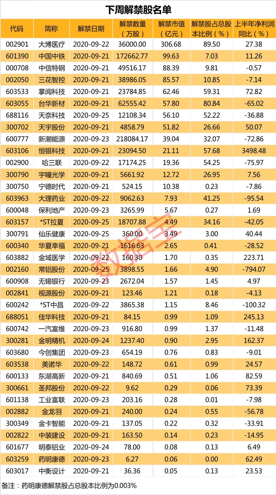 解禁市值规模最大的是大博医疗,下周将有3.6亿股上市流通,主要为发行前股份限售流通,解禁市值高达306.68亿元,公司上市将满三年。大博医疗9月14日晚披露定增预案,为扩大公司骨科植入性高值耗材及口腔种植体的产能,公司拟募资不超过10亿元,用于骨科植入性耗材产线扩建项目3.65亿元,口腔种植体生产线建设项目3.65亿元,补充流动资金2.7亿元。大博医疗的骨科耗材营收六年间增超4倍,今年上半年净利润达到2.64亿元,同比增长27.38%。