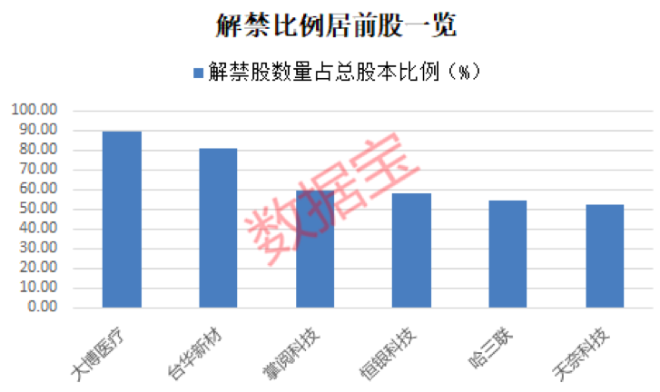 解禁比例同样能反映解禁对股票的冲击程度。数据宝统计显示,共有6股解禁股数量占总股本比例超过50%,分别是大博医疗、台华新材、掌阅科技、智慧银行概念股恒银科技、哈三联和天奈科技。其中大博医疗的解禁比例最大,解禁股数量占总股本的89.5%。其次,台华新材的解禁比例也超过了80%,达到了80.84%,下周将有近6.26亿股上市流通,9月16日,公司通过集中竞价交易方式首次回购股份60.75万股,耗资553.21万元。