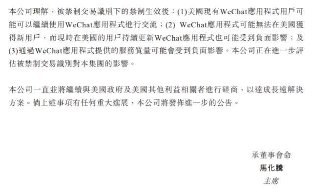 公司认为,美国现有WeChat应用程序用户可能可以继续使用WeChat应用程序进行交流;WeChat应用程序可能无法在美国获得新用户,而现时在美国的用户持续更新WeChat应用程序也可能受到负面影响;通过WeChat应用程序提供的服务质量可能会受到负面影响。公司正在进一步评估被禁制交易识别对集团的影响。公司一直并将继续与美国政府及美国其他利益相关者进行磋商,以达成长远解决方案。