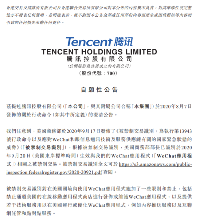 今日晚间,腾讯再次公告:根据被禁制交易识别,美国商务部部长已于2020年9月20日(美国东岸标准时间)生效与我们的WeChat应用程序相关之被禁制交易。