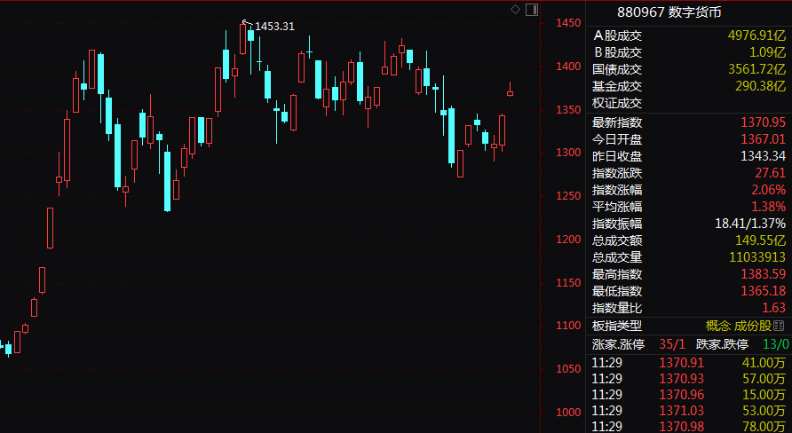 受政策利好促进,今日早盘数字货币板块放量高开高走,板块指数盘中一度大涨3%,半日成交接近前一交易日前天成交。科达股份开盘一字涨停,汇金股份、金固股份、紫光国微、精准信息等纷纷强势拉升。