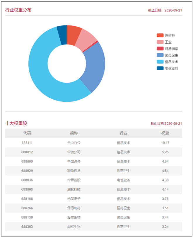 其中,截至9月22日,金山办公、中微公司、南微医学等信息技术行业、医药卫生等行业个股,位居指数前十大重仓股,投资权重位居3%-11%之间。
