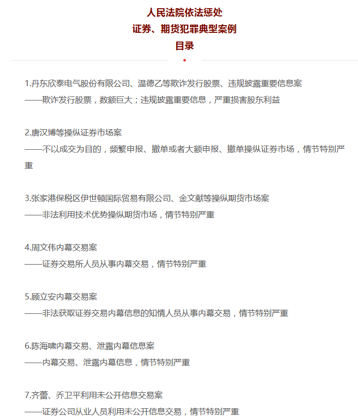 e公司讯,最高人民法院消息,近日,最高人民法院刑三庭组织各地法院集中开庭审理、宣判了一批证券、期货犯罪案件,并收集整理了7件2017年以来人民法院审结的证券、期货犯罪典型案例,现予公布。其中:1件欺诈发行股票、违规披露重要信息案,2件操纵证券、期货市场案,3件内幕交易、泄露内幕信息案,1件利用未公开信息交易案。