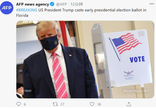 当地时间10月24日,美国总统特朗普在佛罗里达州提前参加了总统选举投票。根据美国广播公司报道,特朗普对现场媒体称,他“把票投给了一个名叫特朗普的人”。