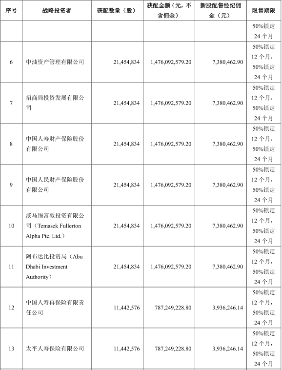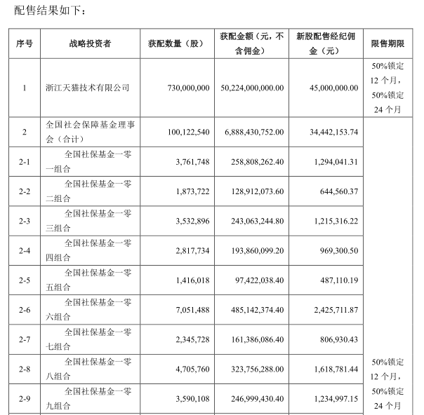 发行公告显示,在A股的初始战略配售股票数13.4亿股,占A股初始发行量80%,该比例创下科创板新高,同时,包括阿里巴巴在内参与战略配售的投资者需承诺1-2年的限售期。截至10月23日(T-4 日)全部战略投资者均已足额按时缴纳认购资金。其中,阿里巴巴旗下天猫获配502.24亿元、淡马锡、阿布达比投资局等多家知名机构均获配14.76亿元;国内公司宁德时代获配7.87亿元等等。