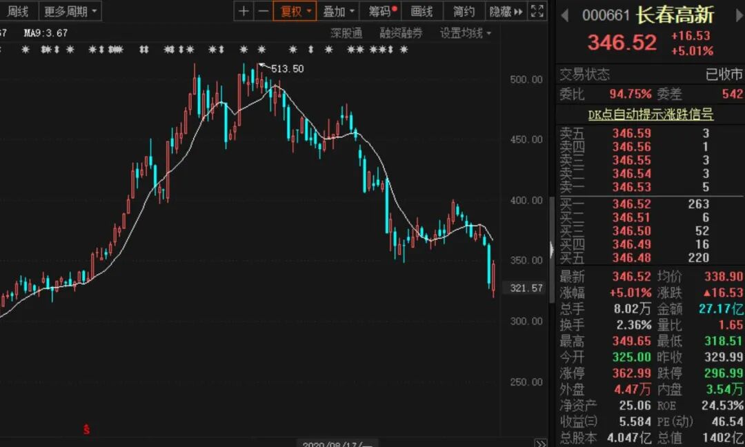 10月25日盘中,长春高新的股价再度触及跌停,收盘时下跌8.84%。10月26日,长春高新展开强势反弹,截至全天收盘时止,长春高新报于346.52元,上涨16.53元,涨幅为5.01%。