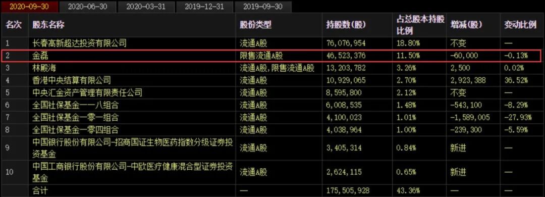 此外,长春高新三季报显示,公司第二大股东金磊的持股数量减少6万股,由半年报时的4658.34万股,减少至三季度末的4652.34万股。