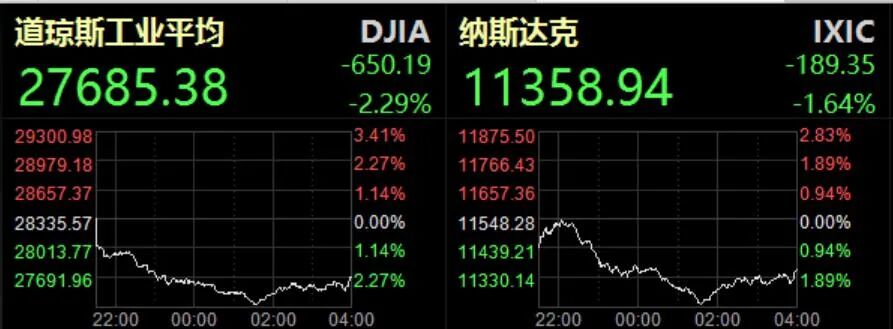 周一,美股再度出现崩盘式走势,美国三大股指集体重挫。不过,尾盘跌幅有所收窄,最终道指收跌650点或2.29%,盘中一度重挫近千点;截至收盘,道指跌2.29%,报27685.38点,标普500跌1.86%,报3400.97点,纳指跌1.64%报11358.94点。