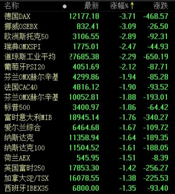 金融股也全线走低,摩根大通跌2.47%,高盛跌1.9%,花旗跌1.57%,摩根士丹利跌2.99%,美国银行跌1.49%,富国银行跌2.49%,伯克希尔哈撒韦跌2.13%。