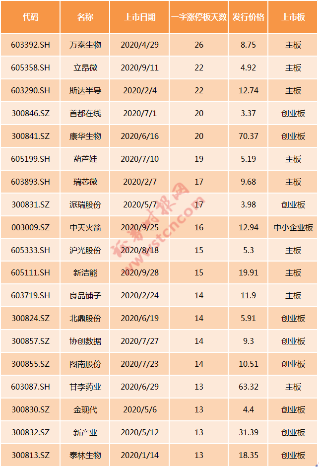 另一方面,以万泰生物、立昂微、斯达半导、首都在线、康华生物为代表的新股则表现强势,挂牌后连续一字板天数达20天或以上。数据显示,今年以来,40只新股上市后一字涨停板天数达10天或以上,占比约25%(剔除注册制个股),其中19股一字涨停板天数达13天或以上。